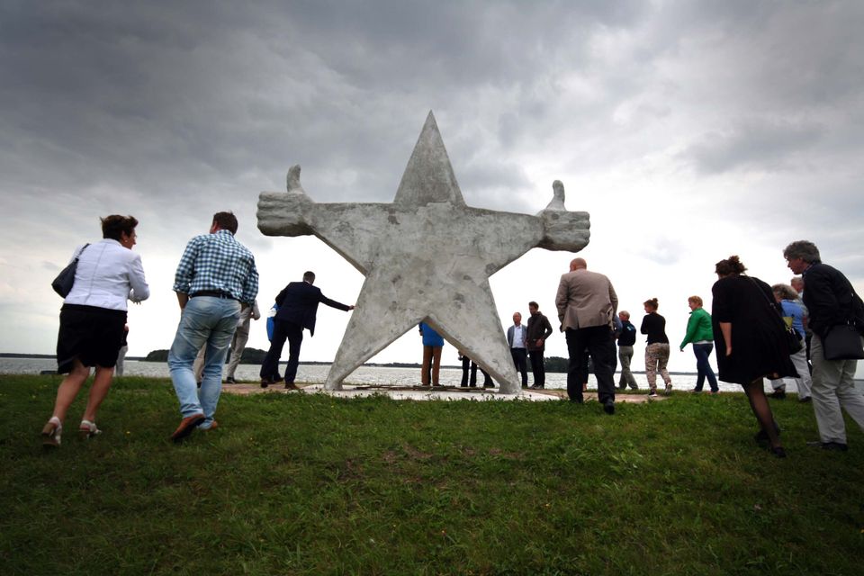 Wie langs de dijk van Biddinghuizen rijdt, vindt dit typerende Drontense monument dat een ode aan de 'prima mens' vormt en gemaakt is door sociaal kunstenaar Domenique Himmelsbach de Vries uit Amsterdam. Het monument is tevens onderdeel van BeKIJK het in de Oostrand, de kunstroute van Dronten.